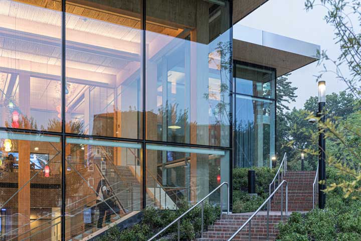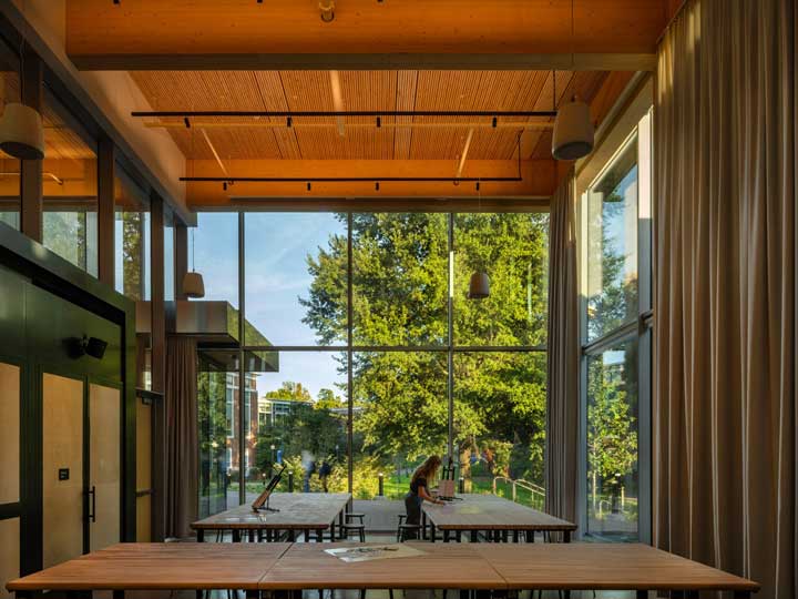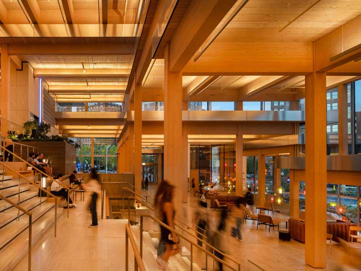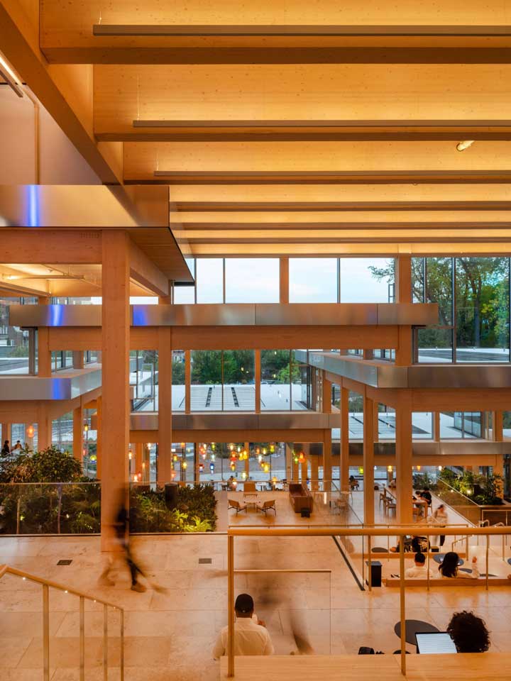 At 14,000 square metres, the building is conceived as a series of timber-framed volumes with flat, cantilevered roofs topped with nearly 1,000 photovoltaic panels, which generate approximately half of the building's electricity. The interior palette is dominated by the exposed, mass timber structure and acoustic dowel-laminated timber (ADLT) ceilings, beams, and columns. Rockwell Group selected limestone and white oak millwork to complement the structure.