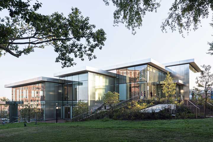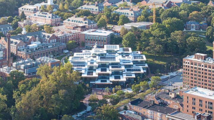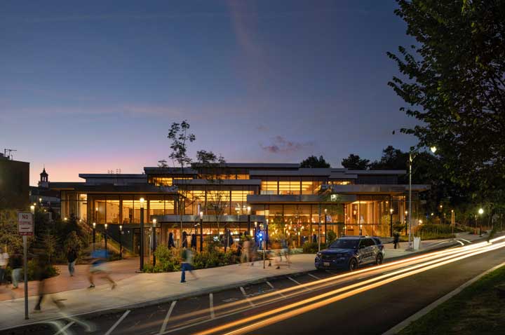 Located on the edge of Johns Hopkins' Homewood campus, the Bloomberg Student Center was designed by BIG and interior architect Rockwell Group as the "first-ever" building to be dedicated solely to student life at the campus. Where student activities at Johns Hopkins University were once dispersed, they are now clustered at the Bloomberg Student Center, a village of 29 timber pavilions climbing the natural hill on the university's edge.