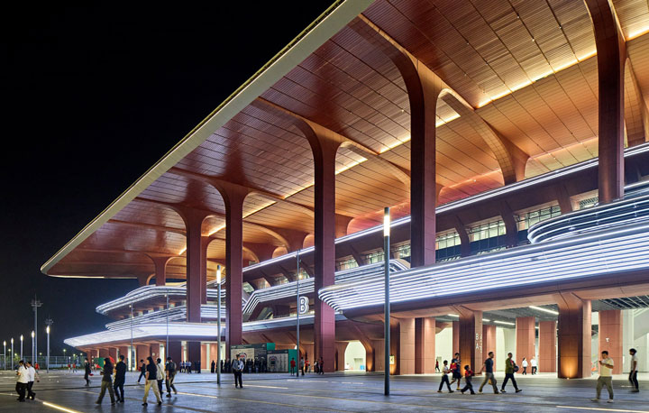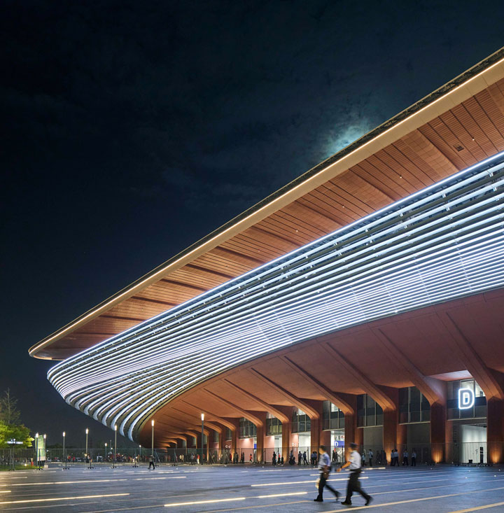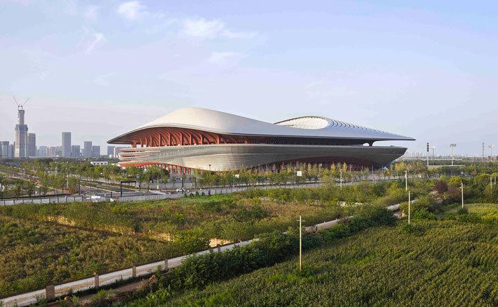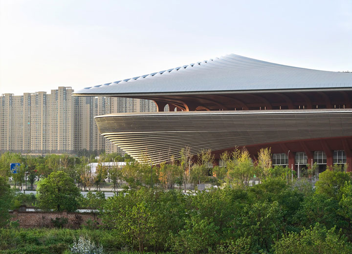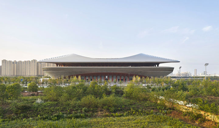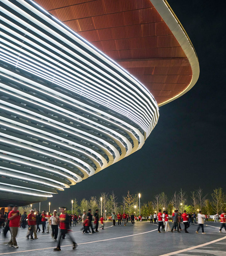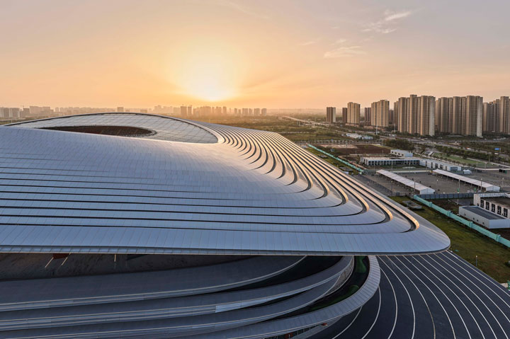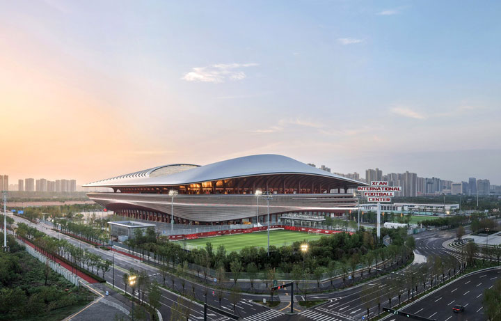 مرکز بینالمللی فوتبال شیآن با طراحی استودیوی معماری زاها حدید، در مرکز چین افتتاح شد. طبق گفته طراحان پروژه، فرم سینوسی شکل این استادیوم۶۰ هزار نفره برگرفته از زمستانهای بادخیز و تابستانهای گرم شهر میباشد. فرم سیال سقف در مرکز جایگاههای اصلی بالاتر میرود تا تعداد صندلیهایی که در مطلوبترین جایگاه تماشا قرار دارند (در اطراف خط میانی کنار زمین بازی) افزایش یابد. طبقه بالایی استادیوم با یک محوطهی وسیع احاطه شده است که با سقفی گسترده و معلق محافظت میشود. این تراسها در ضلع جنوبی استادیوم از نما پایین میآیند تا یک منطقهی سرپوشیده شبیه به میدان تفریحی ایجاد کنند. ستونهای بتنی قرمز که تراسها را سوراخ میکنند، سازهی سبک سقف را پشتیبانی میکنند.
