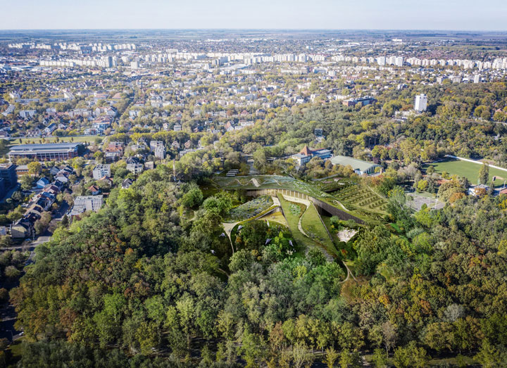 گروه معماری BIG برای طراحی موزه جدید تاریخ طبیعی مجارستان در شهر دبرسن انتخاب شده است. این موزه ۲۳۰۰۰ مترمربعی در لبه شمالی جنگل بزرگ شهر (ناگیردو) واقع شده که در گذشته یک زمین ورزشی بوده است. کانسپت پروژه شامل سه روبان همپوشاننده است که از کف جنگل بالا میآیند و یک فضای عمومی و علمی را شکل میدهند. موزه BIG با سازهای حجیم از چوب و نمای چوبی سوخته، تا حدی در دل زمین فرو رفته و با محیط پارک پیرامون خود ترکیب شده است. در عین حال سقف شیبدار آن با داشتن چشم انداز وسیعی از شهر، برای عموم در دسترس است. این طرح، میدانهای تفریحی باز، مسیرهای جنگلی پر پیچ و خم و مناظر قاببندی شدهای را از هم از فراز و هم از دل ساختمان به زیبایی ادغام میکند. نتیجه نهایی یک تپه مصنوعی در یک محوطه جنگلی است؛ از نظر هندسی چشمگیر اما همچنان ارگانیک و همسو با طبیعت.
