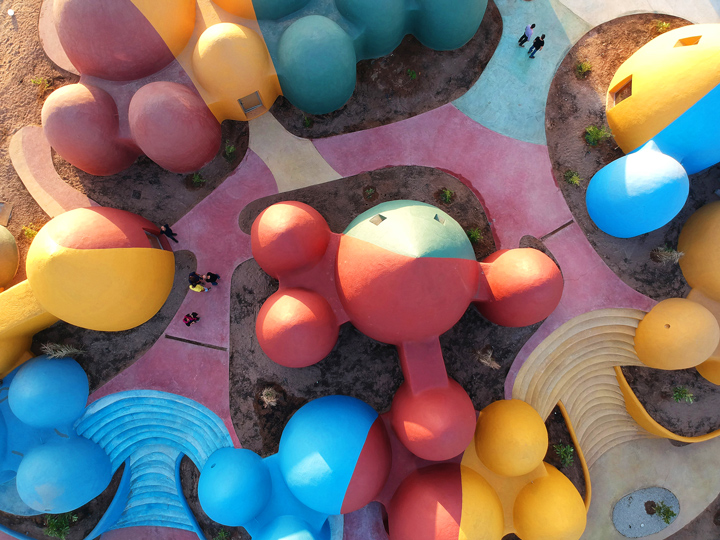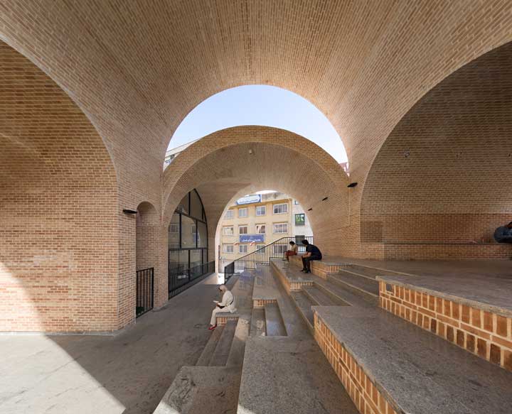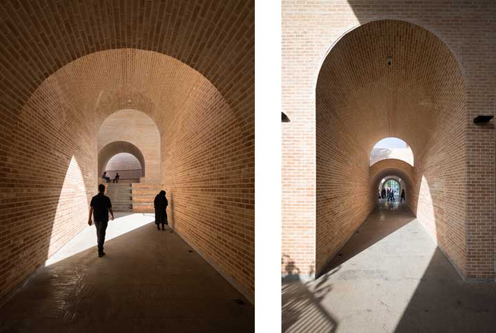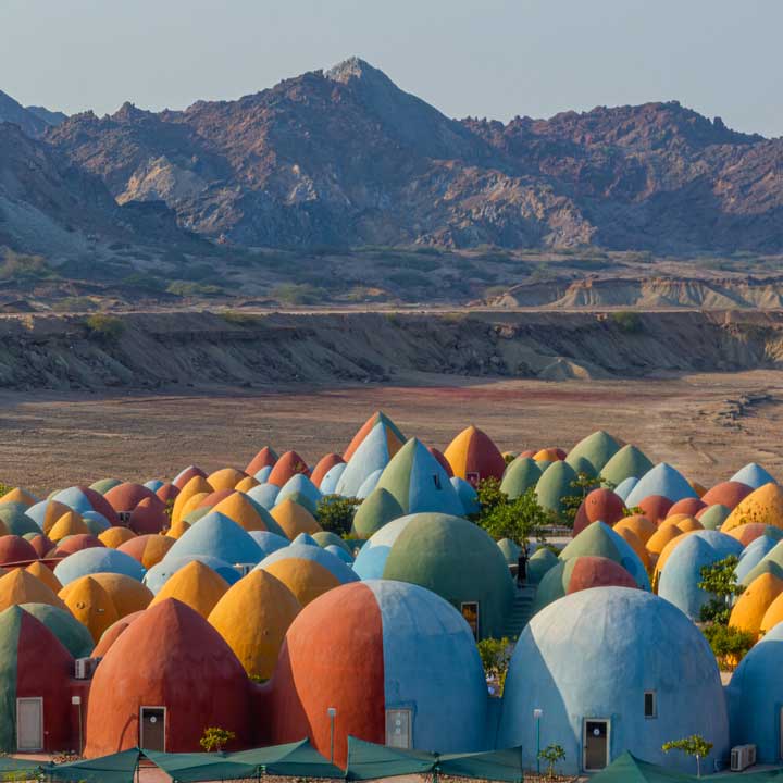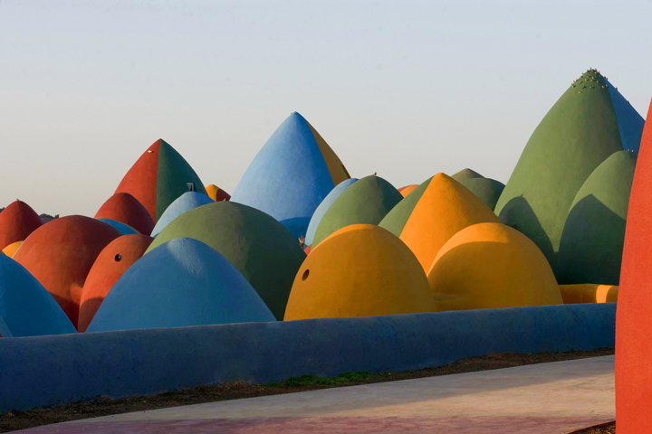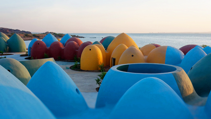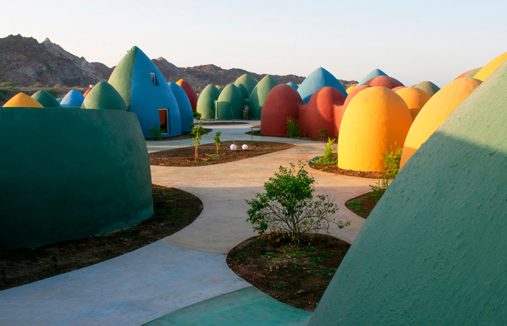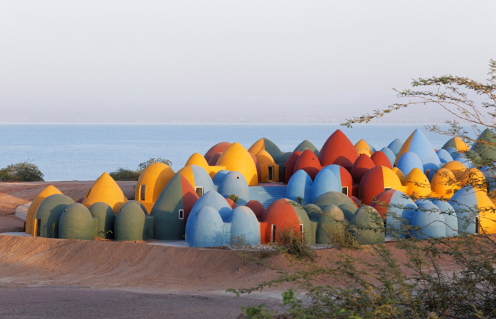 گنبدها سازههای آشنایی در منطقه هستند. ساختار این پروژه مجموعهای از گنبدهای کوچک است که با تکنیک ابرخشت نادر خلیلی ساخته شدهاند؛ تکنیکی نوآورانه و ساده با استفاده از خاک کوبیده شده و شن. کیسههای شنی که گنبدها را ایجاد میکنند، با شن لایروبی اسکله هرمز پر شدهاند؛ گویی زمین متورم شده است تا فضایی برای اسکان ایجاد کند. مقیاس کوچک آنها باعث میشود که با قابلیتهای ساختمانی صنعتگران محلی و کارگران غیرماهر که برای این پروژه با پروژههای کوچکتر قبلی آماده شدهاند، سازگار باشند.