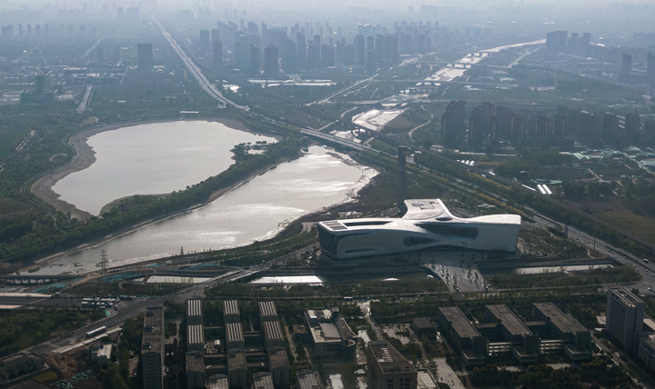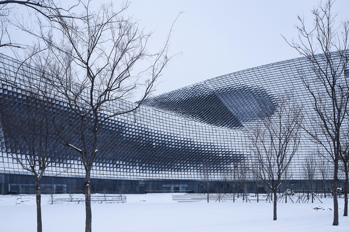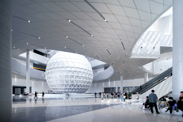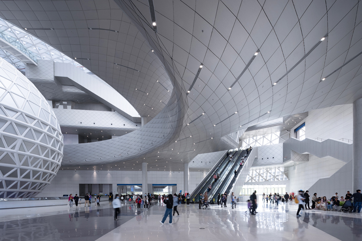 این پروژه که در یک بافت شهری مثلثی و پیچیده قرار گرفته است، از یک طرح فرکتال سه شاخه برای هماهنگی با جهت باد غالب استفاده میکند. نمای آلومینیومی دو لایه آن که به صورت پارامتریک ساخته شده است، سطحی آزاد مانند فلس ماهی را شکل میدهد و در عین حال چالشهای سازه پیچشی آن نیز توسط یک قاب فولادی با پلهای خرپایی ۸۰ متری پشتیبانی میشود. در قلب آن، یک آتریوم مرکزی وسیع ۳۰۰۰ متر مربعی قرار دارد؛ جایی که پل هوایی فولادی سه طبقه با دهانههای عظیم و سکوهای عمومی در هم تنیدهاند و یک سیستم پویا و مداری شکل ایجاد میکنند. سینمای کروی - بزرگترین تئاتر سرپوشیده تمام گنبدی چین - به عنوان نقطه کانونی چشمگیر این فضا عمل میکند.
